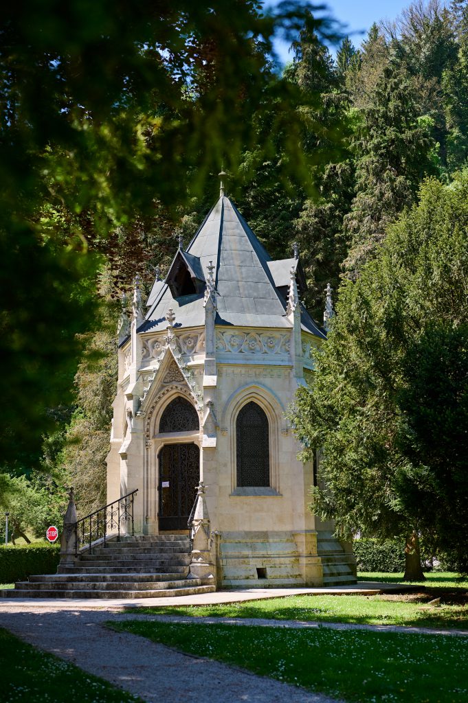 The Hočevar Mausoleum is a distinguished cultural monument built in the Neo-Gothic style and completed in 1890. Noted for its richly articulated architectural elements and exceptional craftsmanship, it reflects a remarkable level of care in the design of both its exterior and interior details. Serving as the final resting place of the Hočevar couple – prominent benefactors and patrons of the town of Krško – the mausoleum stands as a lasting symbol of their legacy. It is gracefully set within the town park, in the southwestern part of the former municipal cemetery.