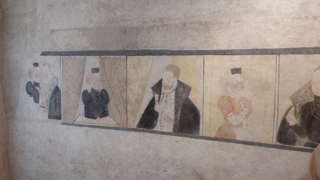 Vodeni ogled smo pričeli v Mencingerjevi hiši. V zgornjem nadstropju severnega dela hiše, ki nosi ime po pesniku, pisatelju, odvetniku in županu dr. Janezu Mencingerju (v hiši je urejena tudi spominska soba), smo si ogledali restavrirano fresko, renesančno poslikavo z dvema grboma, upodobitvijo Boga, obdanega z angeli, ter horizontalnimi pasovi, v katerih se nizajo moški in ženski portreti v značilnih oblačilih.