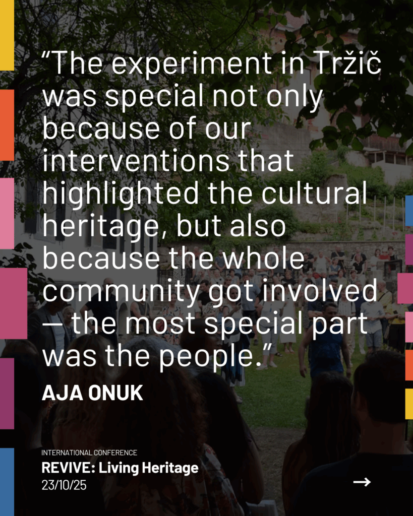 “Eksperiment v Tržiču je bil poseben ne le zaradi naših posegov, ki so izpostavili kulturno dediščino, temveč tudi zato, ker se je vanj vključila celotna skupnost – najbolj poseben del eksperimenta so bili ljudje.” Aja Onuk, udeleženka enega od živih eksperimentov, ki je potekal v Tržiču.