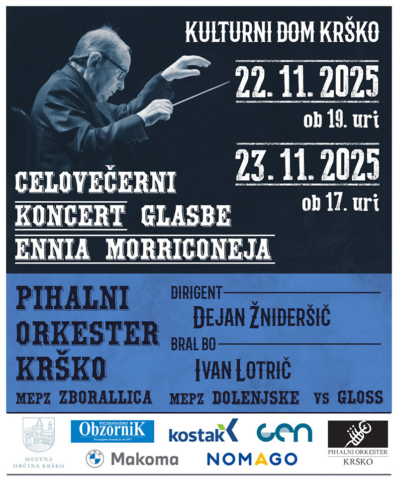 Pihalni orkester Krško že skoraj 70 let, z bogato tradicijo in širokim repertoarjem, oblikuje glasbena potovanja, ki segajo od klasičnih orkestralnih del do sodobnih glasbenih aranžmajev. Tokrat se bodo skupaj z MePZ Zborallica in MePZ Dolenjske podali na glasbeno potovanje skozi brezčasna dela enega največjih filmskih skladateljev vseh časov – Ennia Morriconeja. Njegove skladbe, ki so zaznamovale filmsko zgodovino in ostajajo sinonim za čustveno moč glasbe, bodo na odru zaživele v mogočni sinergiji orkestralne in zborovske izvedbe v aranžmaju domačega skladatelja Dejana Učakarja.