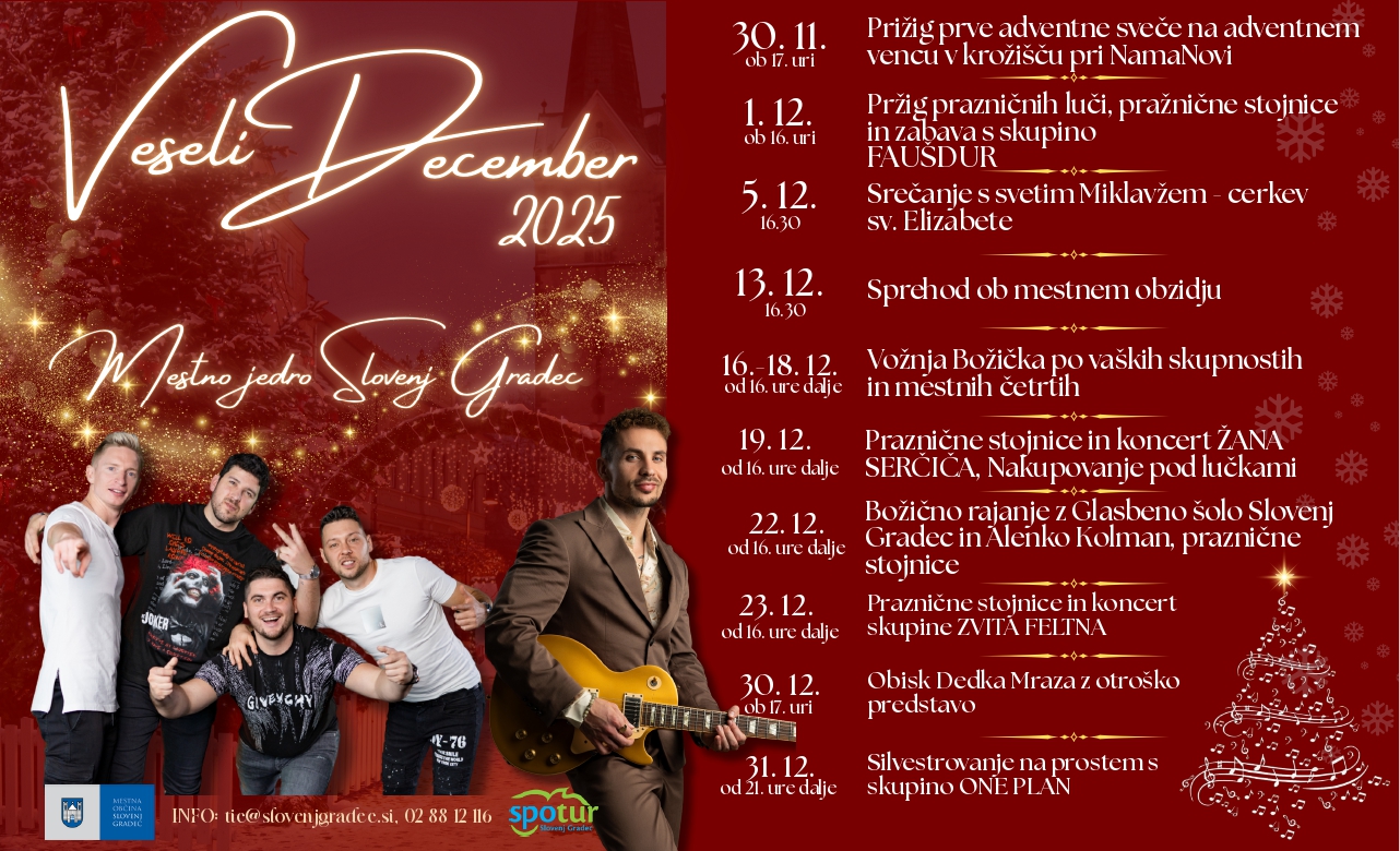 Vabimo vas, da obiščete čarobni Slovenj Gradec, kjer se praznični december prepleta z duhom tradicije in veselja. Mesto se bo v tem času odelo v čudovite praznične dekoracije, ki bodo pričarale nepozabno vzdušje. Pridružite se nam na številnih dogodkih, ki vključujejo božično tržnico, kulturne prireditve in delavnice, kjer boste lahko spoznali lokalne običaje in izdelke. Ne zamudite priložnosti, da uživate v praznični atmosferi in ustvarite nepozabne spomine s svojimi najdražjimi. V Slovenj Gradcu vas pričakujemo z odprtimi rokami in prazničnim vzdušjem!